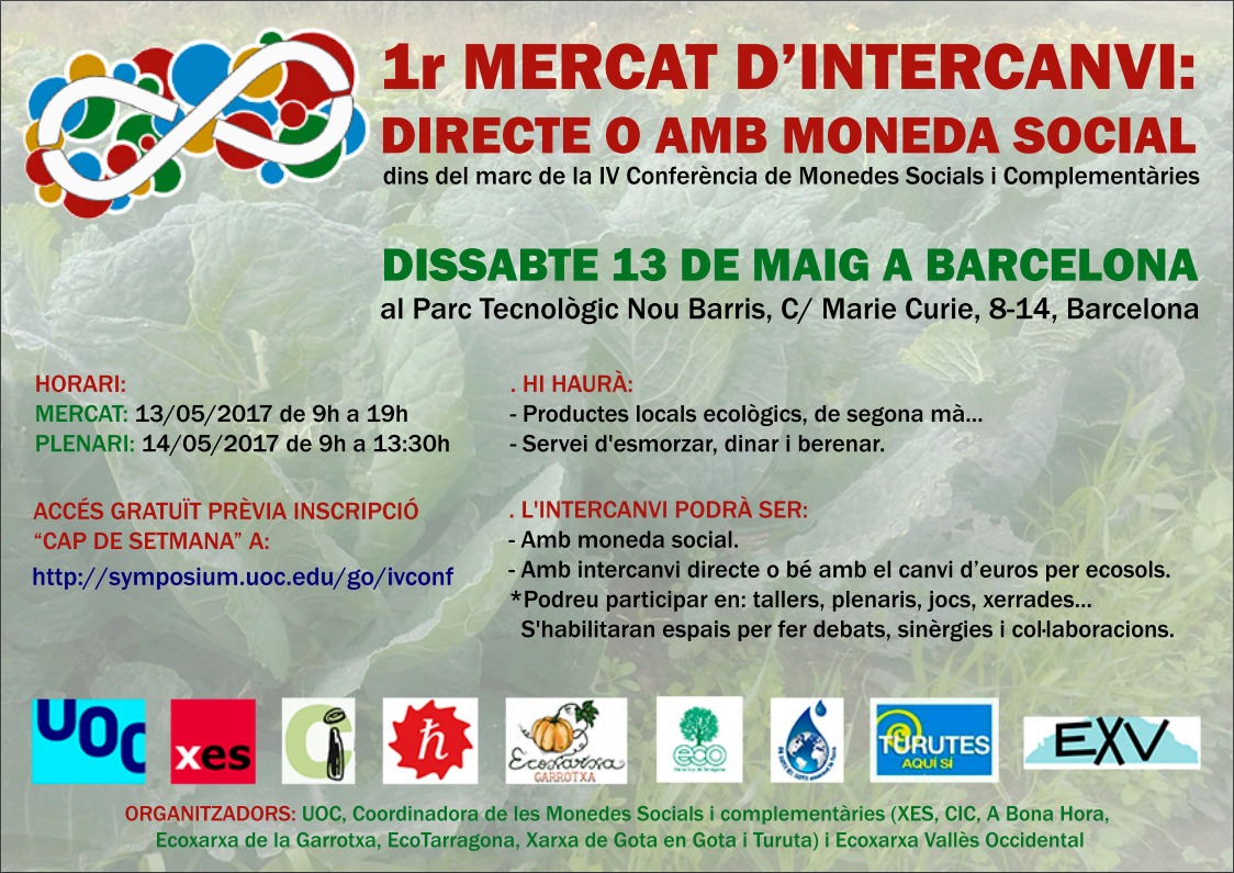 Les monedes socials són un fenomen emergent global. Els propers 10 i 14 de maig es celebrarà a Barcelona la quarta edició de la Conferència Internacional de Monedes Socials i Complementàries. En aquest esdeveniment s’hi apleguen centenars de persones interessades, des d’un punt de vista acadèmic, en les monedes socials. El dissabte però som les activistes de les xarxes del territori les que tindrem el protagonisme amb un seguit de tallers, xerrades i el mercat.