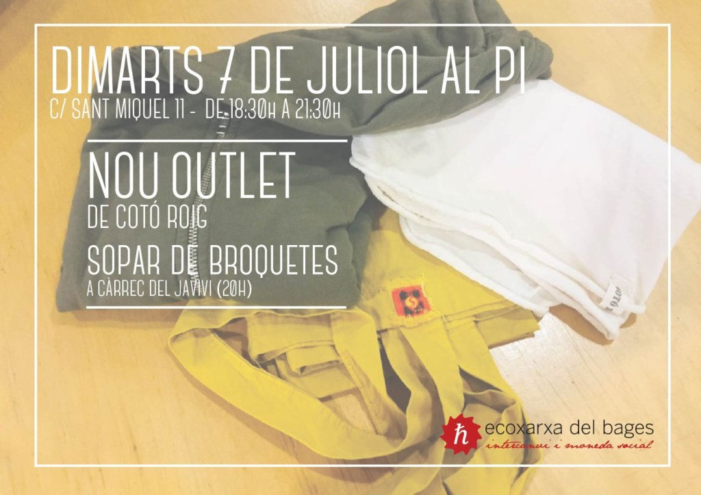 Dimarts passat va ser el tast d’olis Agrumato del col·lectiu Efemera i aquest proper dimarts 7 de juliol tindrem el segon Outlet en moneda social de Cotó Roig i a partir de les 20h sopar de broquetes del Javivi. I com sempre de 18:30h a 21:30h la terrassa oberta a la fresca del barri antic Manresà.