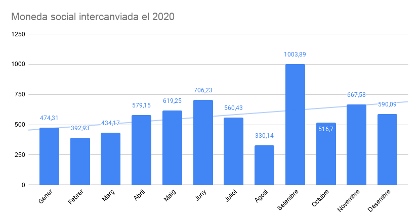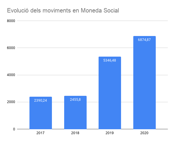 Comencem amb la suma de la moneda social que ha circulat el 2020, vista amb la retrospectiva dels darrers anys: