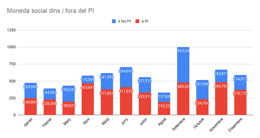 Si mirem mes a mes, veiem que ha estat al PI on s’ha mantingut l’activitat durant el confinament i que en canvi els mesos de llibertat de moviments han permès l’ús de la moneda social fora del PI. Gràcies a les que han estat obrint el PI cada setmana sense ni una sola excepció en un any tan difícil!