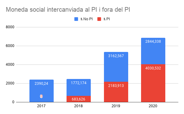 Els moviments del PI aquest 2020 han estat de 4030ℏ, cosa que significa un increïble creixement del 85% respecte l’any anterior i un 59% de tota la moneda social intercanviada dins l’Ecoxarxa. El total intercanviat fora del PI retrocedeix una mica -un 9%- respecte l’any anterior, cosa que s’explica per les restriccions i que, amb tot, és una xifra prou bona.
