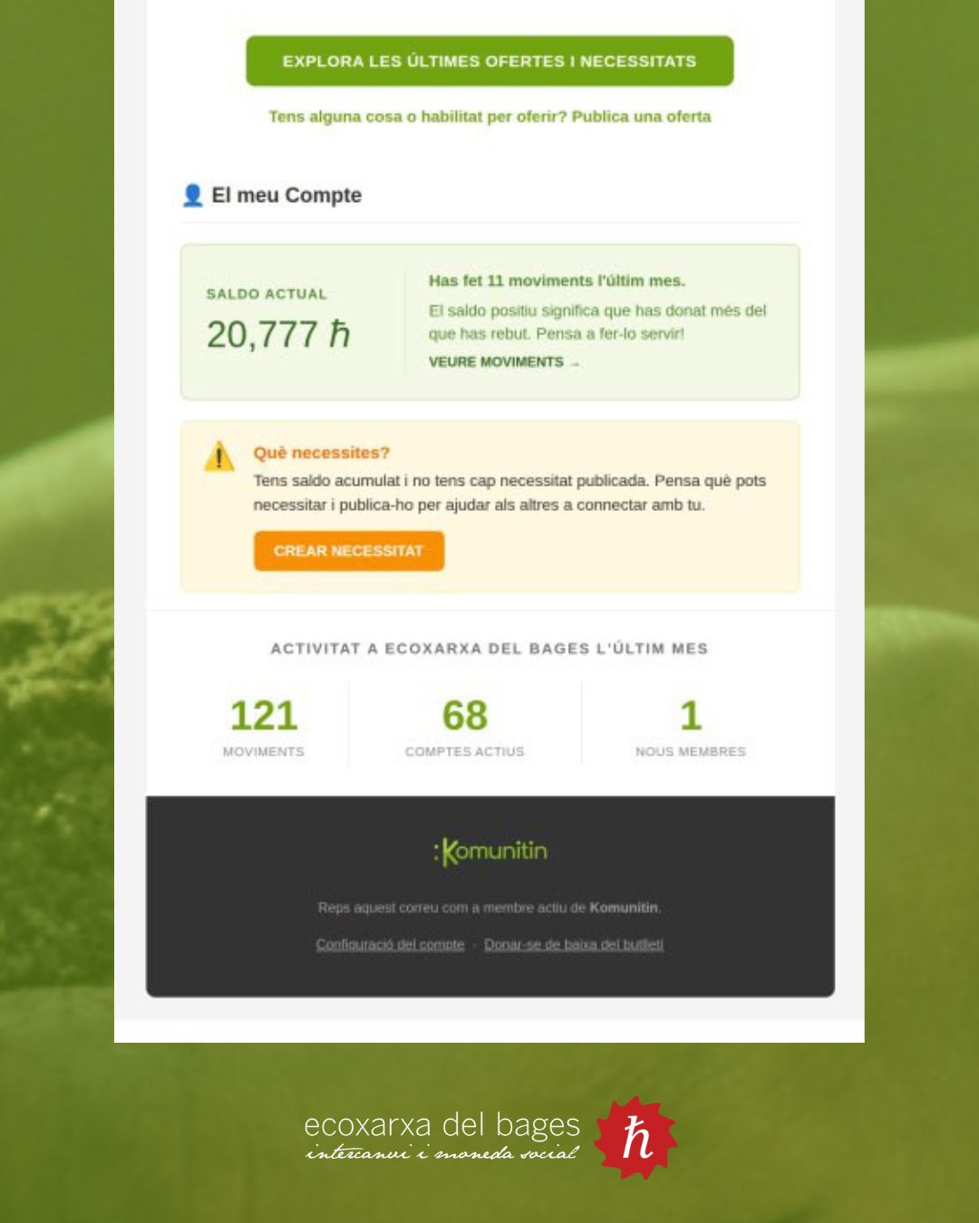 Gràcies a l’aplicació que utilitzem, el Komunitin (@komunitin), hem programat un butlletí automàtic per a posar-nos al dia de les novetats a la nostra comunitat👌🏽