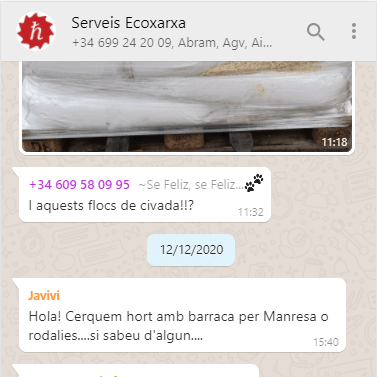 Tenim un grup de whatsapp per a membres de l’ecoxarxa on pots demanar els serveis o productes que necessitis i també el que ofereixis en moneda social. Demana que t’hi afegeixin fent un missatge al tel +34 656 68 22 84. A més també tenim un altre grup per a compartir informacions, articles, videos, discutir, etc. Pots entrar-hi aquí.