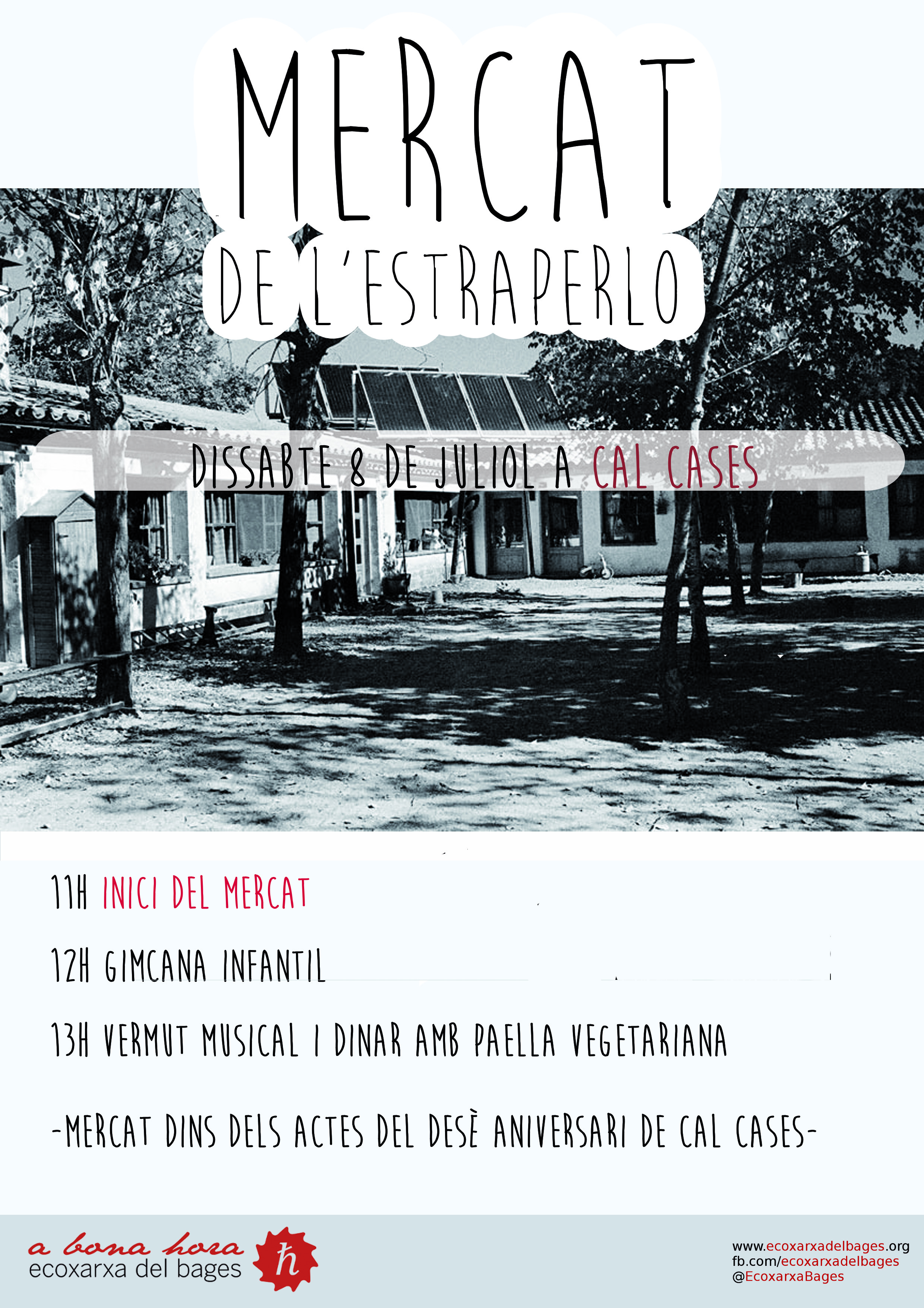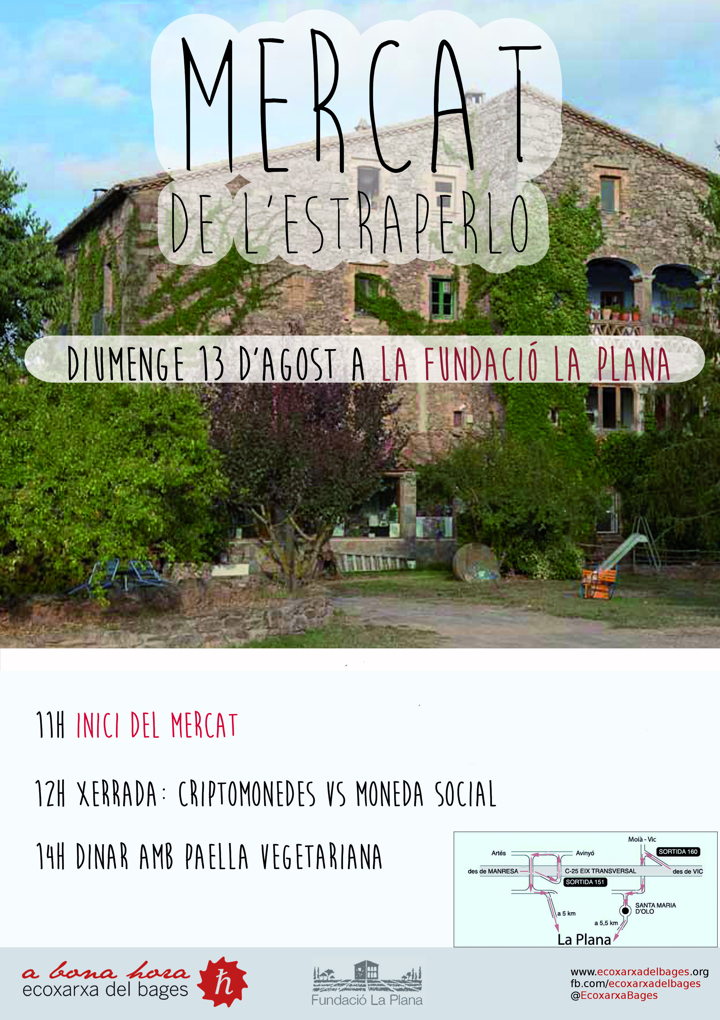 Com cada any per aquesta època, ens trobarem a l’ombra dels arbres del pati de la masia de La Plana, dins el municipi de Santa Maria d’Oló (Com arribar-hi?). L’Estraperlo és la darrera activitat dins les Jornades d’Estiu de La Plana. A més del mercat, a les 12:00 hi haurà un taller sobre primers auxilis a càrrec de Cristina Lliró, i a les 13:00 un concert de Hang (el cartell està equivocat). Per dinar tindrem la tradicional paella de verdures.