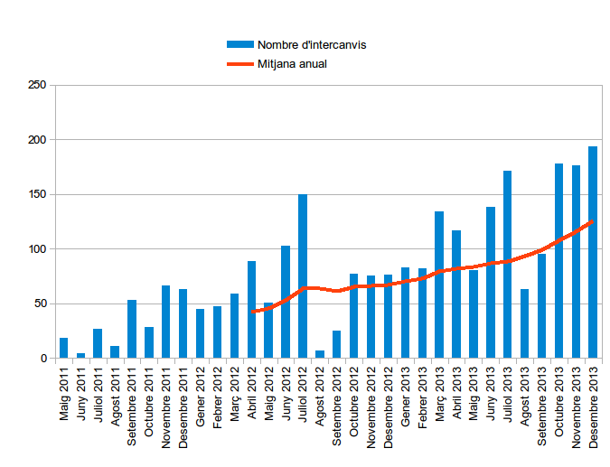 Durant l’any 2013 hi ha hagut un total de 2390ℏ intercanviades en 1511 intercanvis. Això significa un increment d’un 36% de les hores intercanviades respecte el 2012 i un increment del 87.9% del nombre d’intercanvis també respecte l’any anterior.