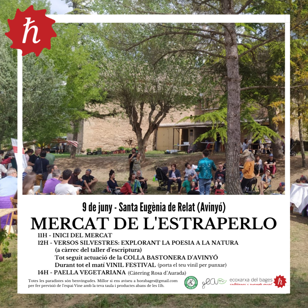 El diumenge dia 9 de juny farem Mercat de l’Estraperlo a Santa Eugènia de Relat (Avinyó) (Com arribar-hi). Ens fa especial il·lusió tornar a celebrar l’Estraperlo en aquest espai. A més de les parades del Mercat, també hi haurà un mostra de Versos silvestres: Explorant la poesia a la natura (a càrrec del taller d’escriptura i amb la col·laboració del Grup Ecologista d’Avinyó) i l’actuació de la Colla Bastonera d’Avinyó.